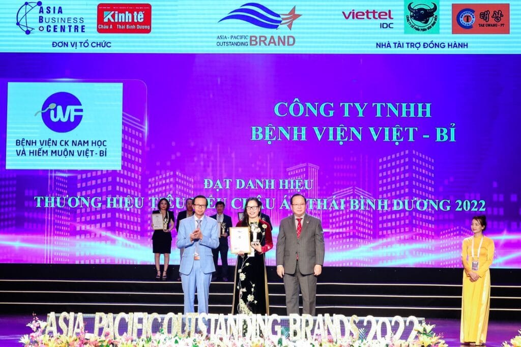 Công ty TNHH Bệnh viện Việt – Bỉ vinh dự đón nhận danh hiệu top 10 Thương hiệu tiêu biểu Châu Á – Thái Bình Dương 2022 (Asia – Pacific Outstanding Brand 2022) lần thứ 8 do Tạp chí Kinh tế châu Á – Thái Bình Dương tổ chức. Giải thưởng nhằm tôn vinh những thương hiệu tiêu biểu tại khu vực và ghi nhận những đóng góp cho quyền lợi người tiêu dùng, góp phần thúc đẩy kinh tế quốc gia trong giai đoạn hội nhập và phát triển.